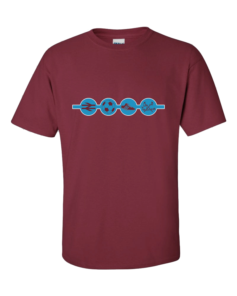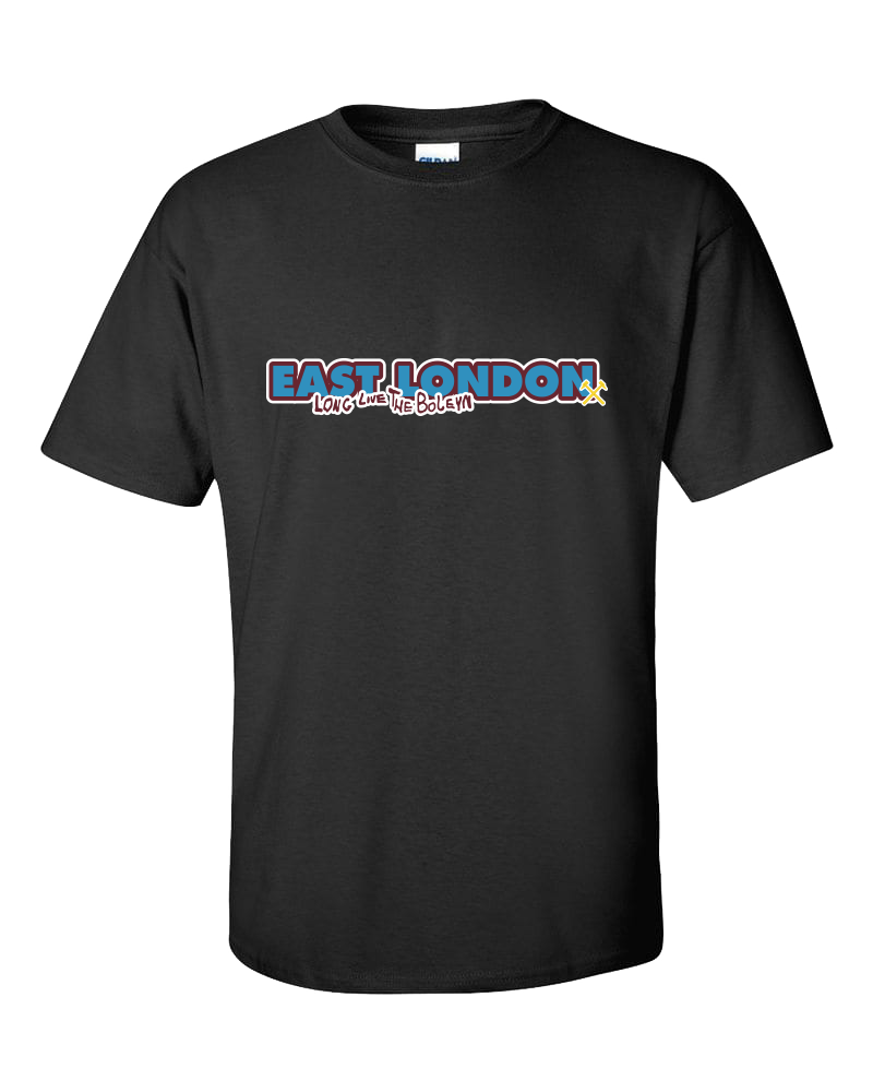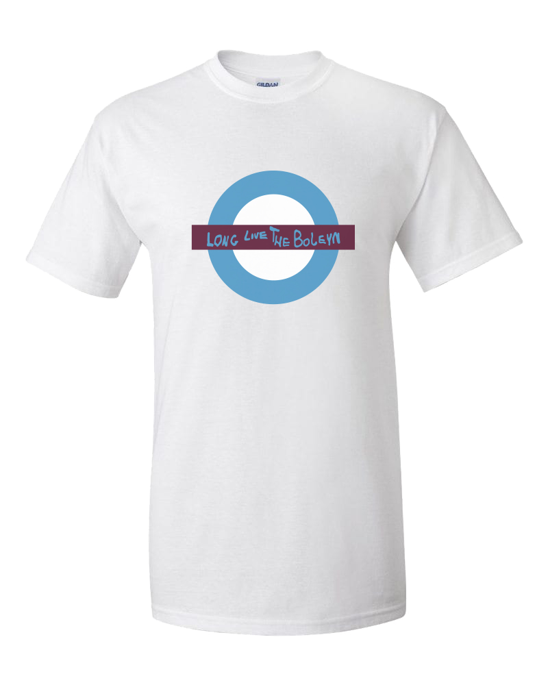 A white or grey t-shirt with 'Long Live The Boleyn' printed to the chest in a claret and blue design inspired by the London Underground logo.