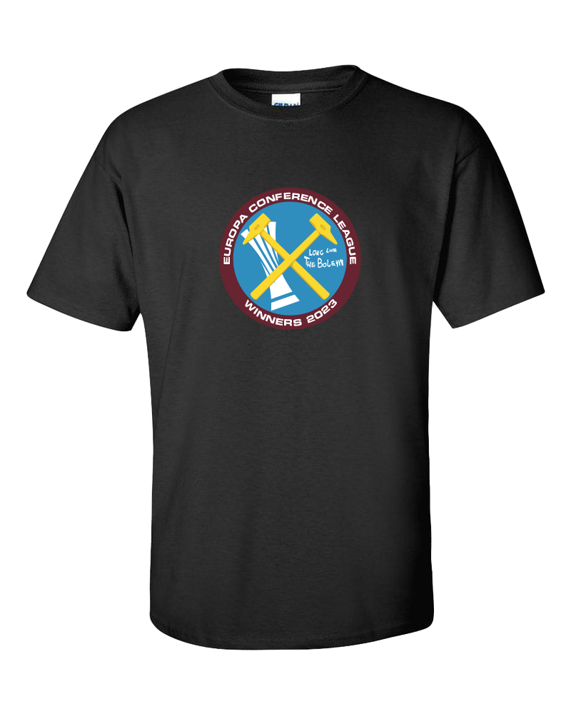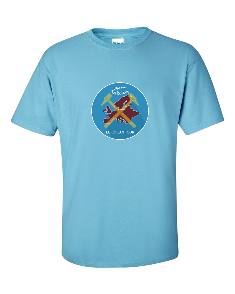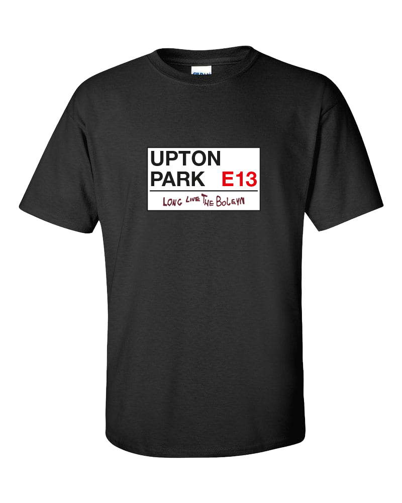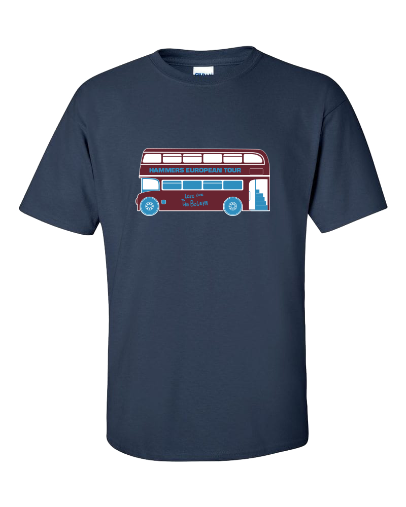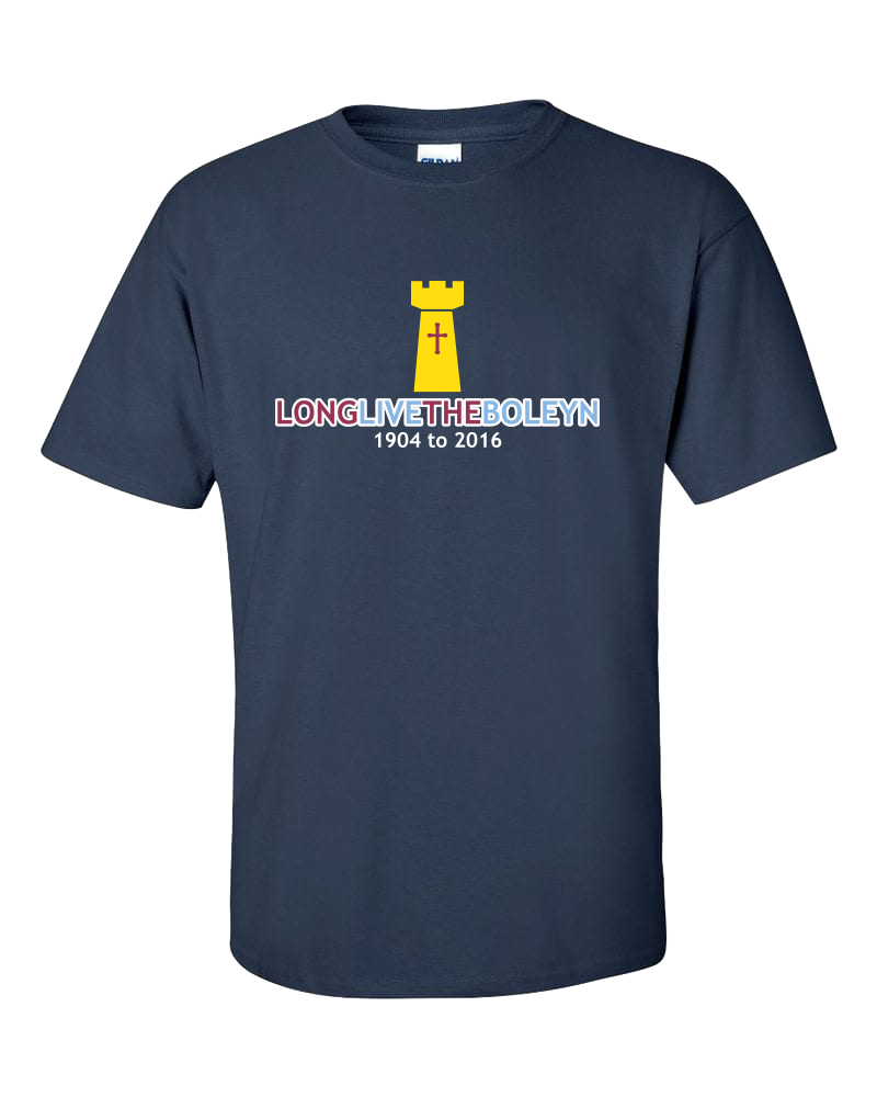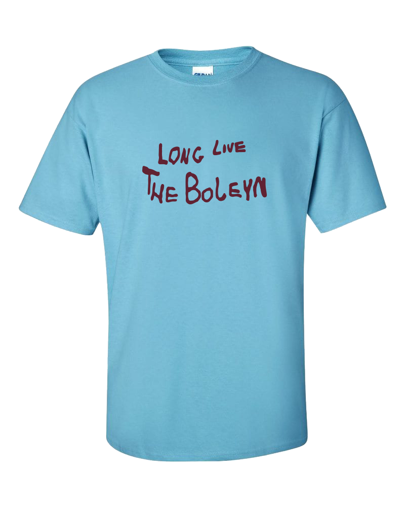 A blue T-Shirt with 'Long Live The Boleyn' screen printed in claret