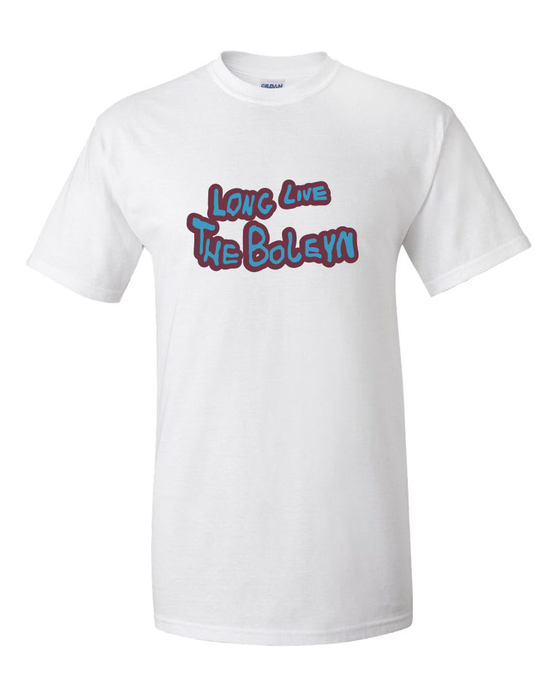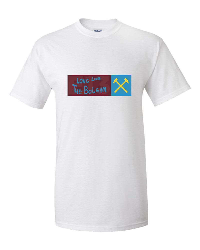 A white t-shirt with 'Long Live The Boleyn' screen printed in claret and blue to the chest.